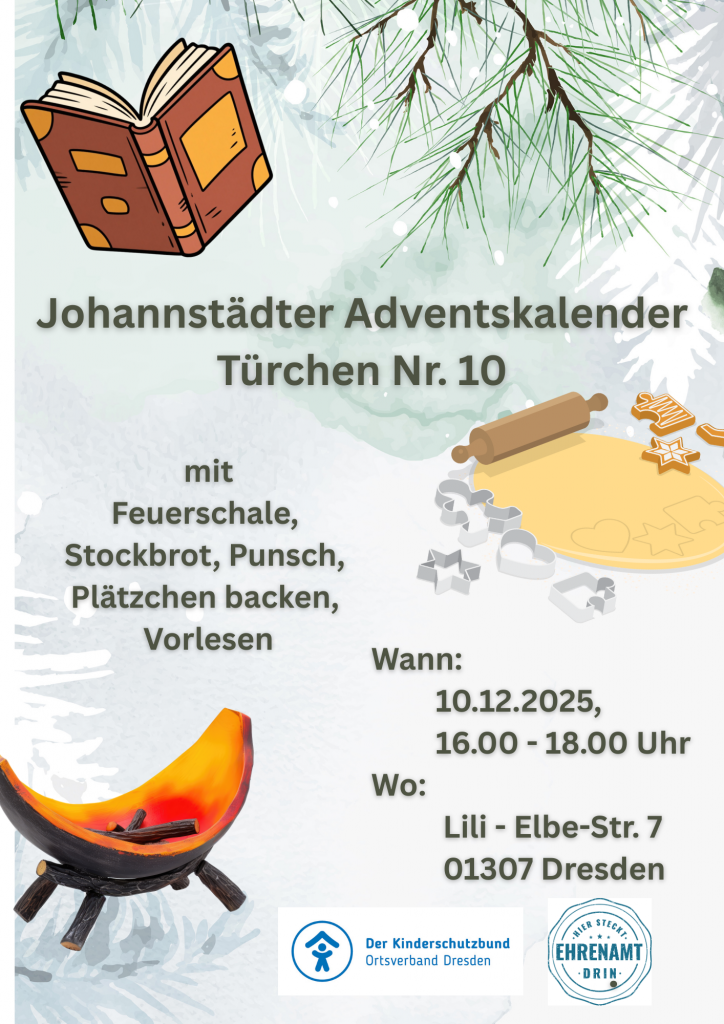 Am Mittwoch sind wir Gastgeber für Klein & Groß in der Lili- Elbe-Str.7 mit Vorlesezeit im Bibliotop, Punsch und Stockbrot an der Feuerschale und Plätzchenbacken. Herzlich Willkommen beim Kinderschutzbund in der „Schokofabrik“.